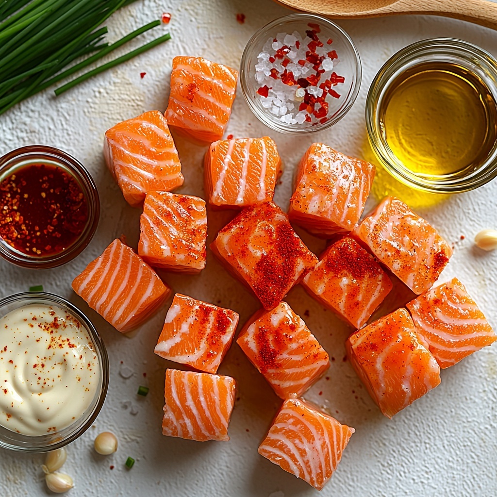 Every ingredient in this Air Fryer Bang Bang Salmon Bites Recipe has a purpose, contributing to the dish’s vibrant taste and inviting texture. These essentials are easy to source but combine brilliantly to create layers of flavor and a gorgeous appearance.