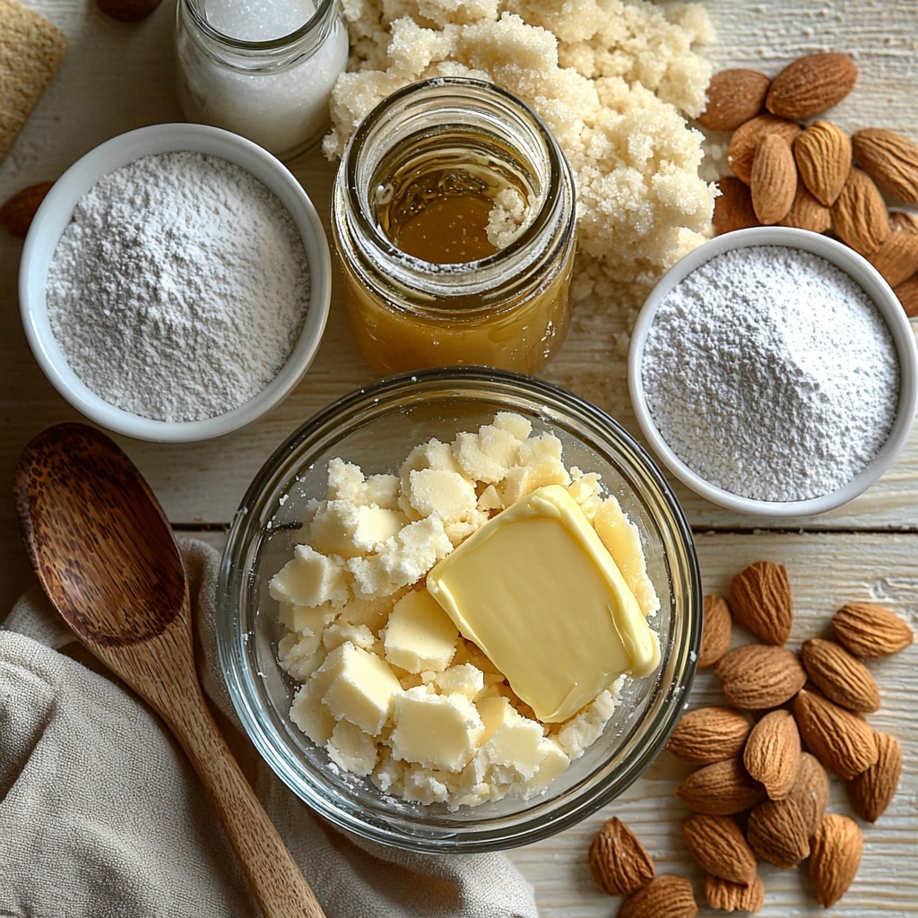 This Almond Crescent Cookies Recipe calls for ingredients that are simple yet essential to create that perfect balance of texture and taste. Each plays a crucial role in making the cookies tender, flavorful, and visually appealing.