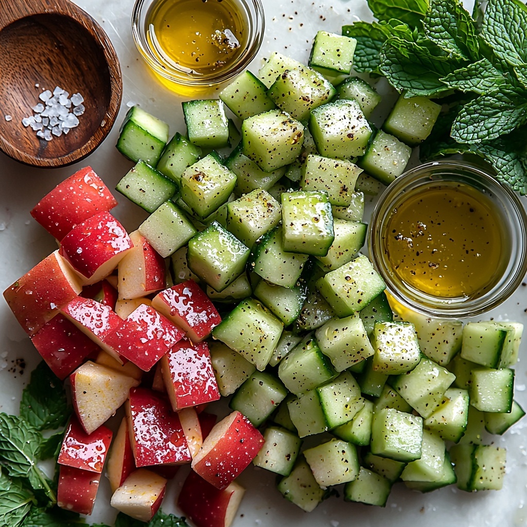 A refreshing and crisp Apple and Cucumber Salad combining the sweetness of apples with the cool crunch of cucumber, enhanced with a light apple cider vinegar and mint dressing. Perfect for a quick, healthy side dish or snack.