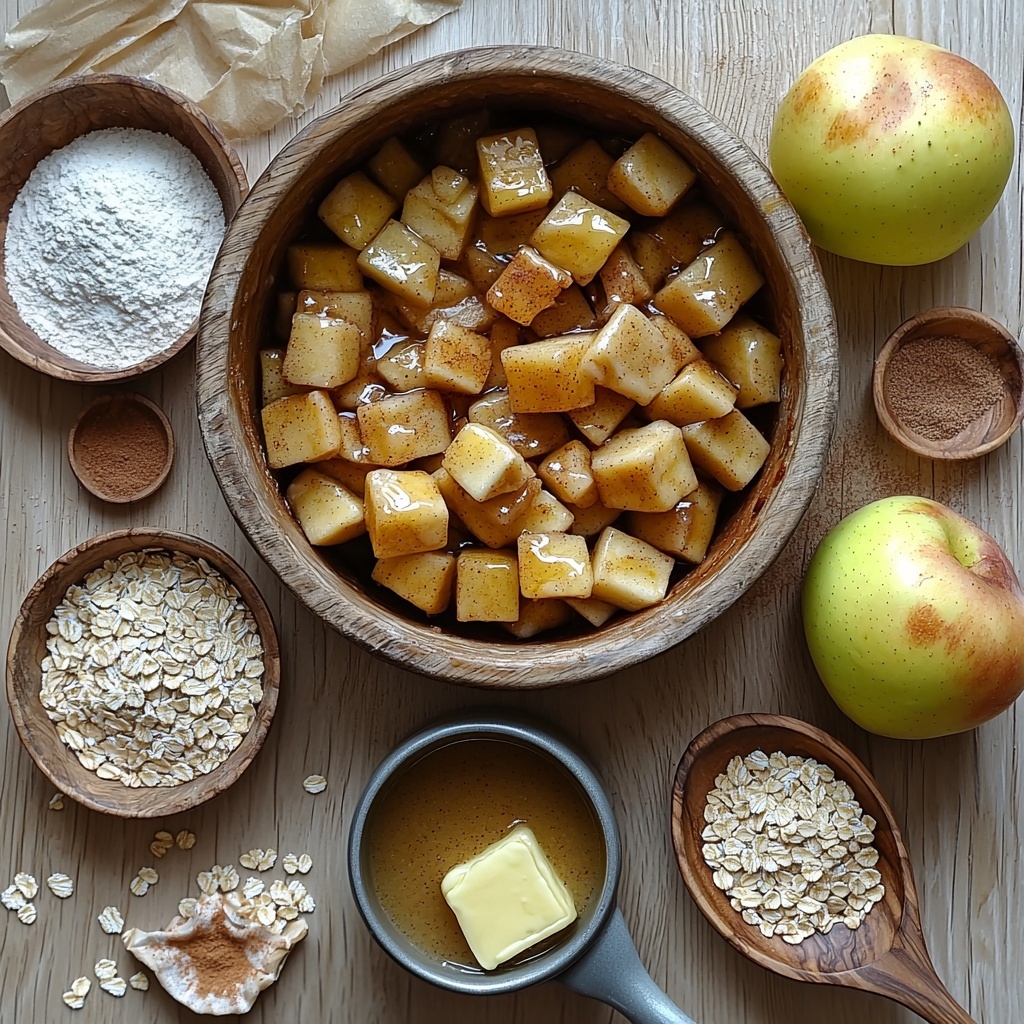 First things first, get your oven nice and hot at 400° F. While it’s warming up, mix together the dry crumble topping ingredients in a bowl—flour, oats, brown sugar, granulated sugar, and cinnamon. Then, with chilled butter cubes, use a pastry knife or two forks to cut the butter into the mixture until it’s crumbly but still holds together in little clusters. This topping will bake into the golden, crispy finish that contrasts perfectly with the soft apples inside.