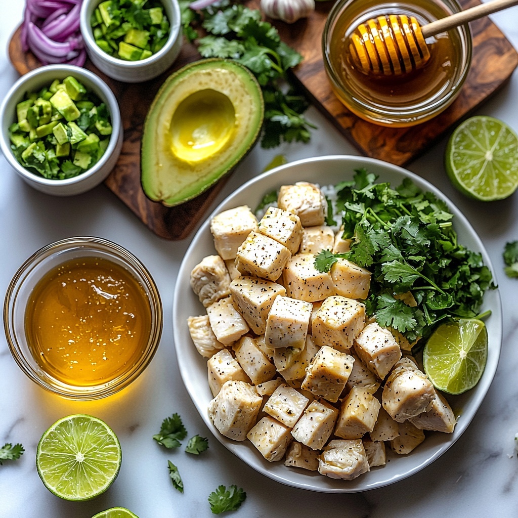 The charm of the Avocado Rice Stack with Grilled Honey-Lime Chicken Recipe lies in its simple yet thoughtfully chosen ingredients. Each one plays an essential role—from the juicy chicken breasts soaking in a tangy marinade, to the fragrant rice cooked in chicken broth, and the creamy avocado mixed with lively herbs. Together, they create an unforgettable balance of taste, texture, and color.