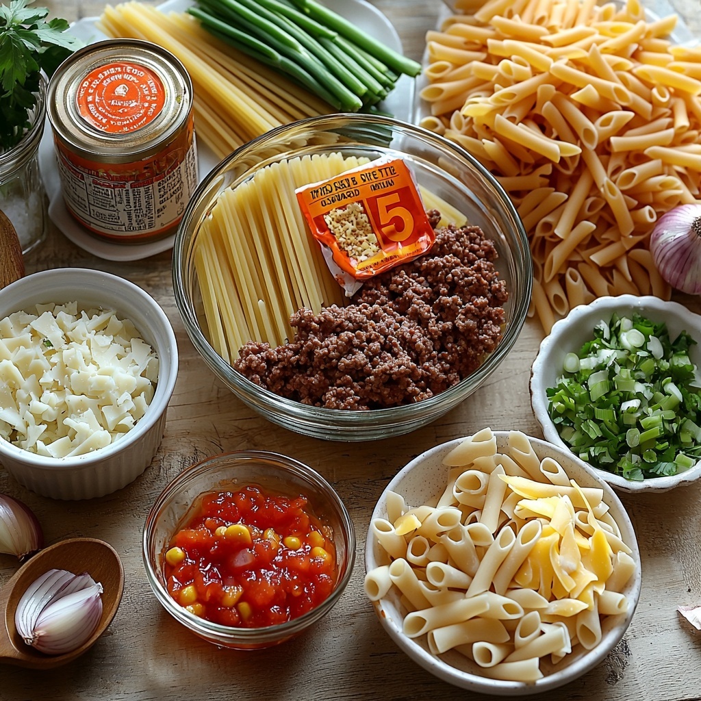 These ingredients may be straightforward, but each one plays a crucial role in building the rich and vibrant layers of flavor and texture that make the Baked Taco Pasta Recipe so irresistible. From the tender pasta that serves as the base, to the spicy taco seasoning and tangy salsa that bring the Tex-Mex spirit alive, every item strikes the perfect balance.