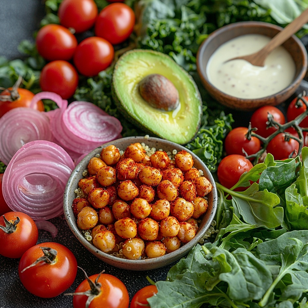 Now it’s time for the fun part—assembly! Start with a base of cooked quinoa or rice to give the bowl some heartiness and texture. Then pile on the vibrant mixed greens for a fresh bite, followed by the crispy roasted chickpeas. Add halved cherry tomatoes for juicy pops of color and flavor, and fan out slices of creamy avocado for lusciousness. If you’re feeling adventurous, throw in some pickled onions for a tangy crunch. Finish it all by drizzling that luscious tahini dressing on top and get ready to dive in.