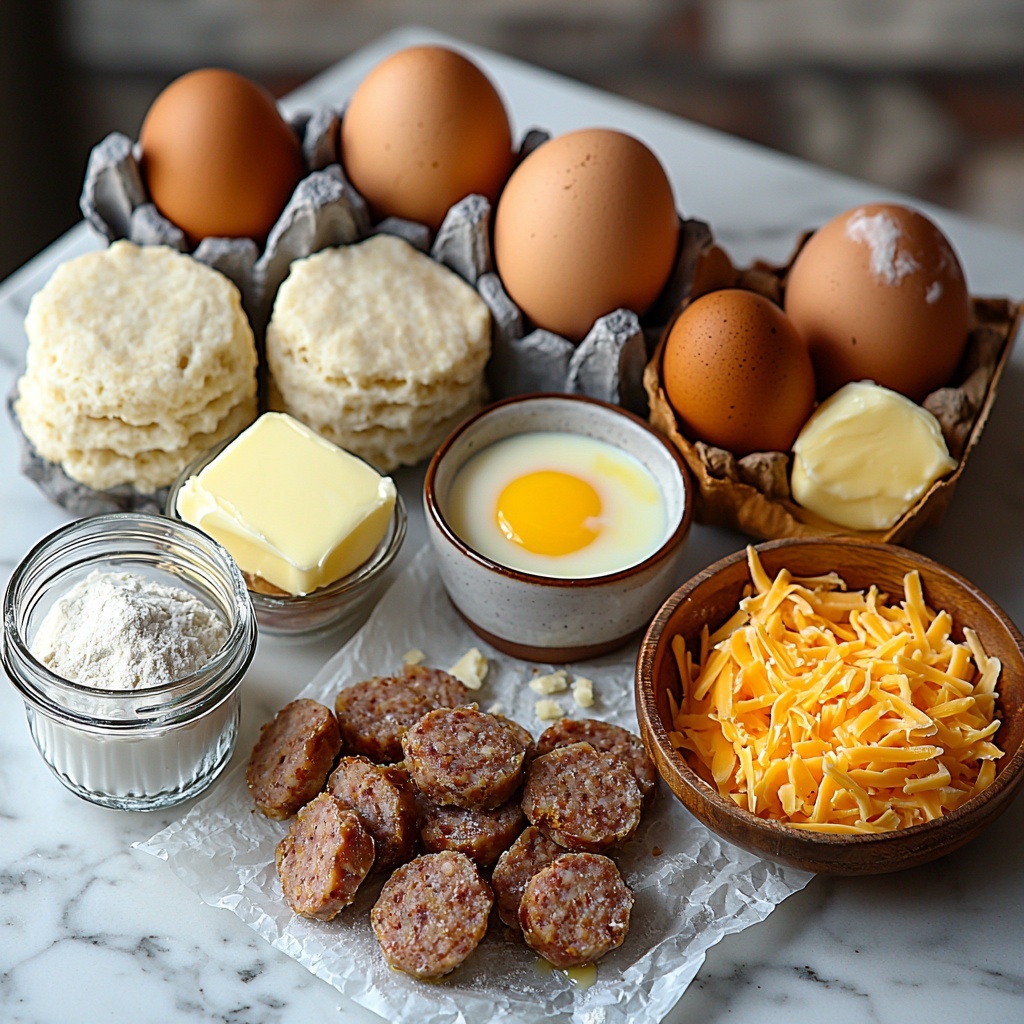 The ingredients for this casserole are wonderfully simple, yet they each bring something special to the table – from the savory sausage and velvety gravy to the fluffy eggs and tender biscuits. Using a quality smoked breakfast sausage and fresh cheddar makes all the difference in flavor and texture, making this dish truly shine. Here’s what you’ll need: