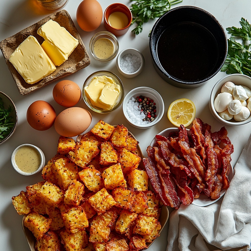 These ingredients are delightfully simple but come together to create an unforgettable combination of textures and flavors. Each element plays a vital role—from the crispy base of baked hash browns to the creamy, tangy hollandaise sauce that ties it all together beautifully.