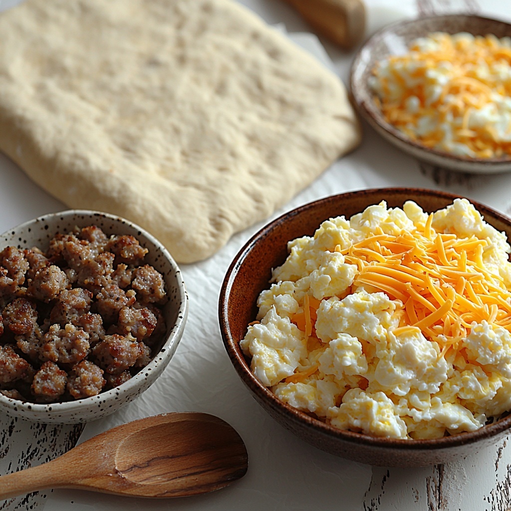 - Assemble Filling: Spread the soft scrambled eggs evenly over the dough, leaving a 3-inch border clear around the edges. Sprinkle the cooked and drained sausage evenly over the eggs, then top with most of the shredded cheese, reserving a few tablespoons for the top.