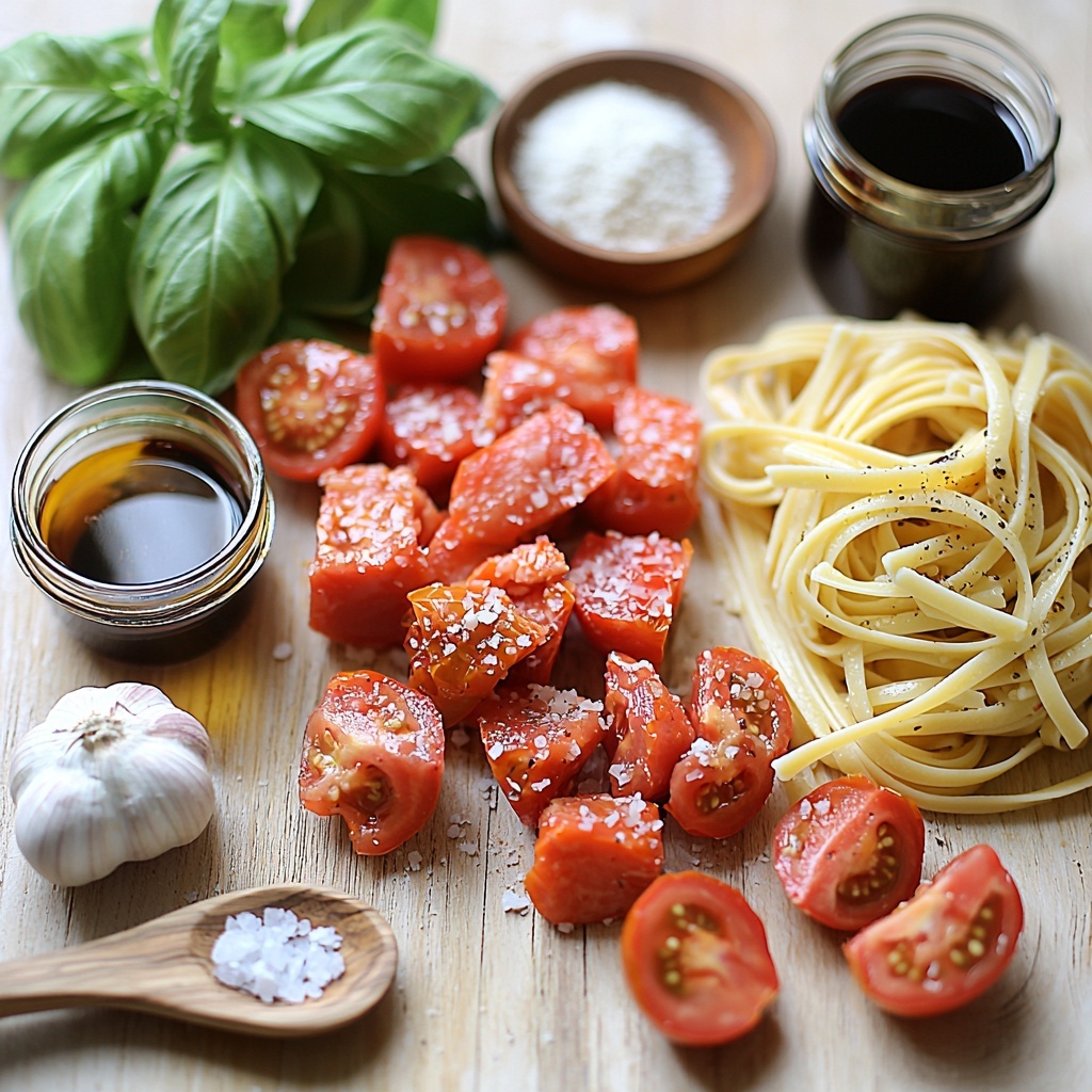 Creating this Bruschetta Chicken Pasta Recipe starts with simple, fresh ingredients that each add an essential element to the dish’s overall flavor and texture. From sun-ripened tomatoes that bring juiciness and color to the garden-fresh basil that adds an aromatic lift, every component plays a starring role.