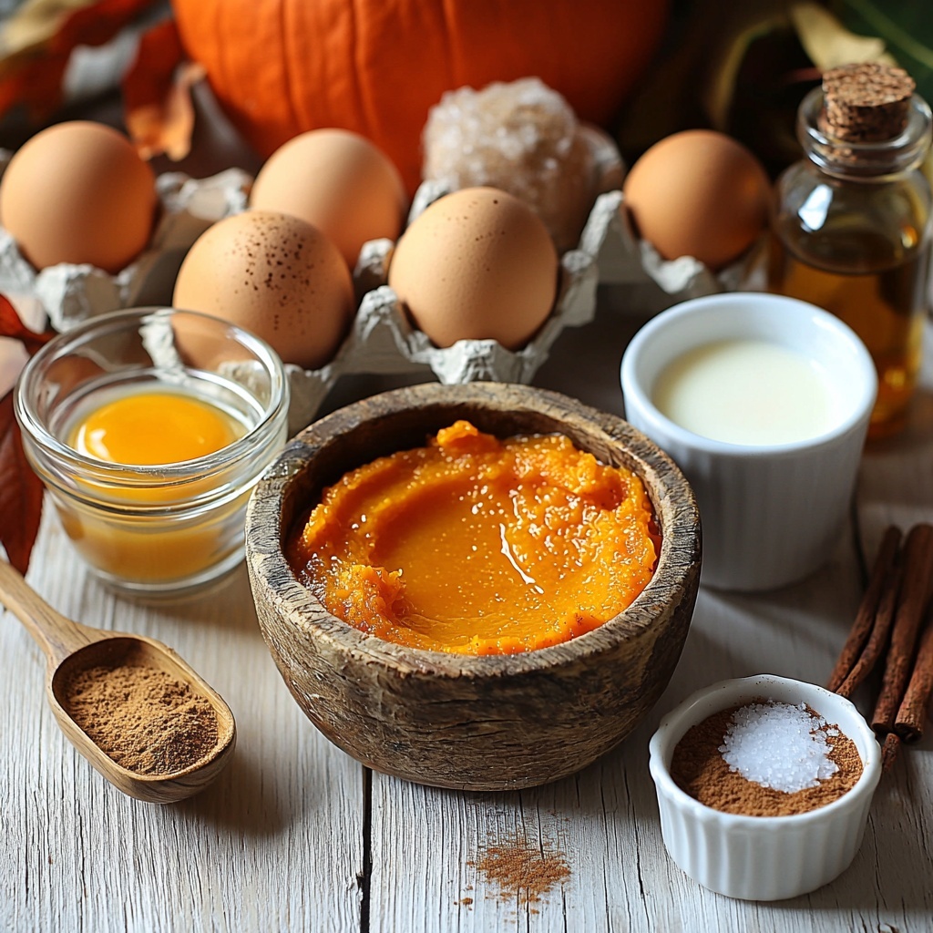 In a large mixing bowl, whisk the eggs and egg yolks with brown sugar and pumpkin puree until smooth and creamy. Next, slowly add the heavy cream and whole milk while continuing to whisk. To this, stir in vanilla extract, pumpkin pie spice, and a pinch of salt. This combination ensures your custard is bursting with flavor and silky texture.