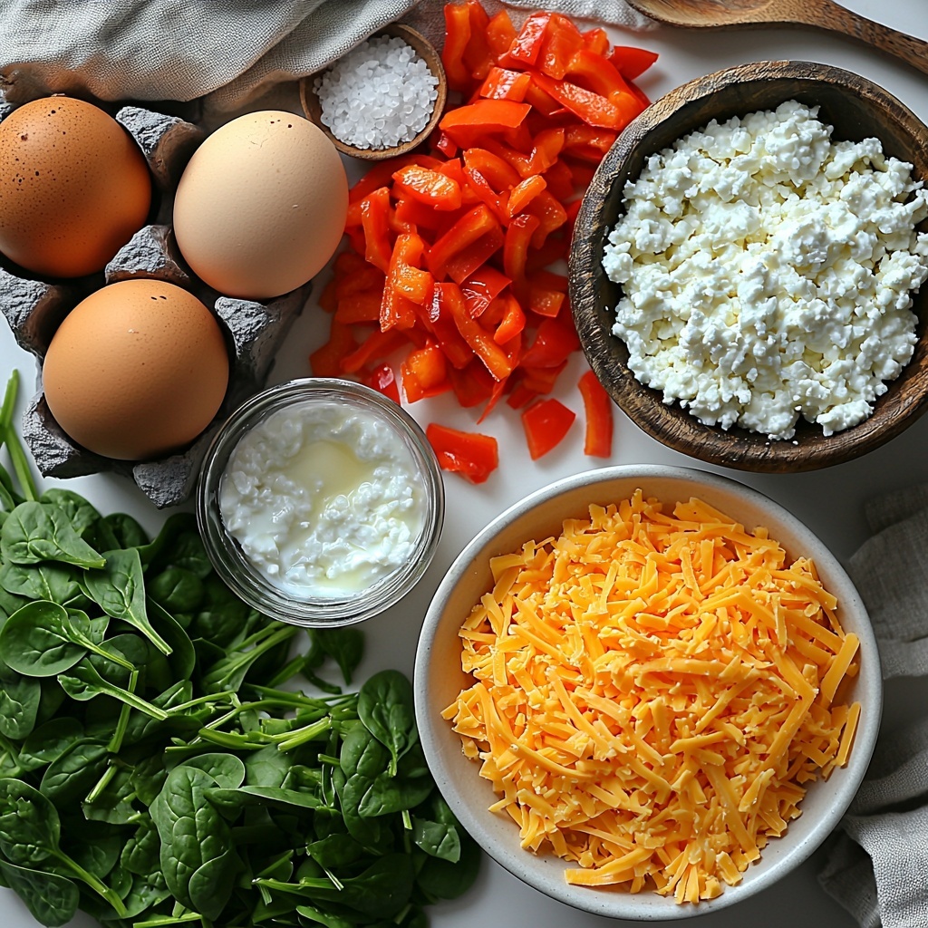 Next, fold in the cottage cheese and shredded cheddar cheese, letting their creaminess meld into the eggs. Stir in the finely chopped red bell pepper, fresh spinach, and green onions. These vegetables contribute vibrant color and fresh flavors that contrast perfectly with the rich cheeses. Finally, season the mixture with garlic powder, salt, and black pepper for balanced seasoning.