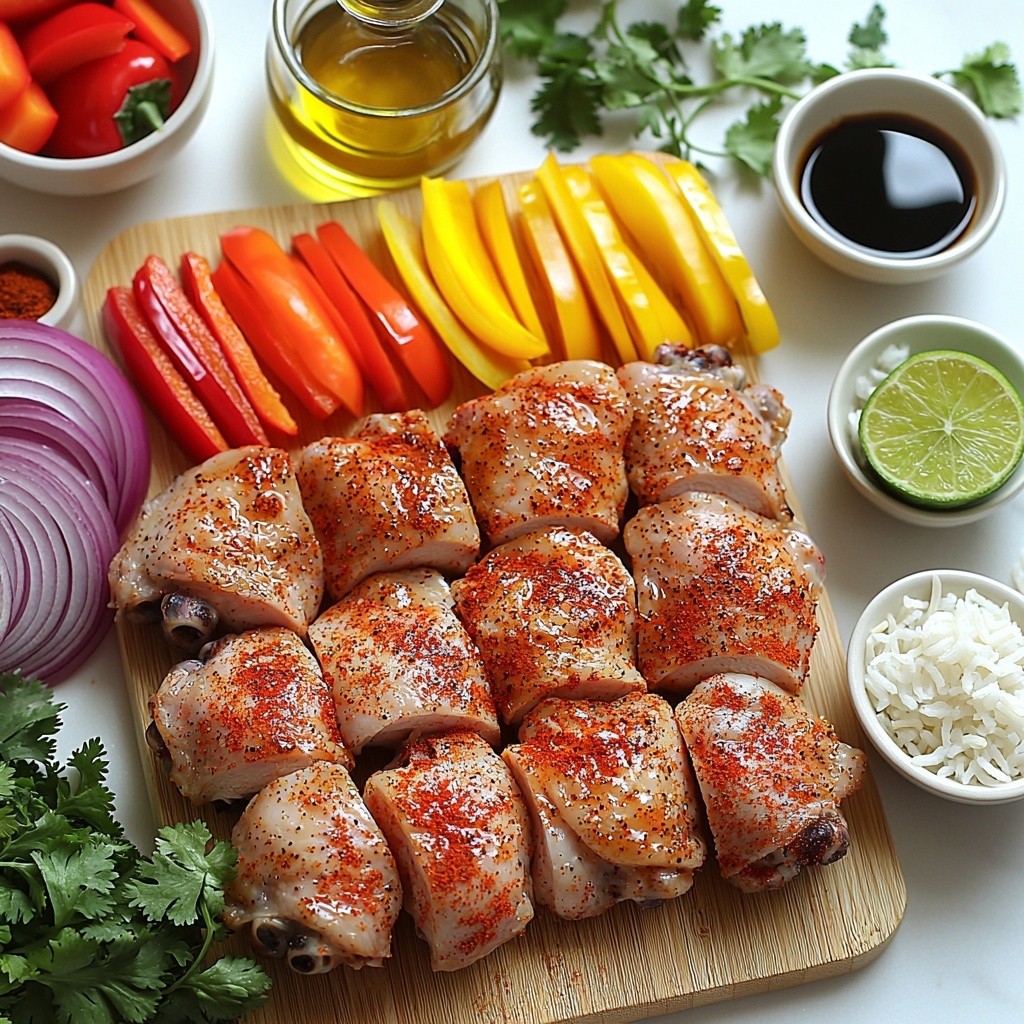 Start by trimming any excess fat off the chicken thighs and placing them in a bowl. Drizzle in olive oil and balsamic vinegar, then toss with tongs to coat evenly. Next, sprinkle the chili powder, paprika, cumin, garlic powder, oregano, onion powder, salt, and pepper on top. Toss once more, ensuring every piece is generously coated with this fragrant spice mix. This step is where your fajita magic begins, infusing the chicken with bold flavors that’ll shine after cooking.