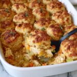 A hearty and flavorful Chicken Pot Pie with a spicy twist from buffalo sauce. This comforting dish combines tender shredded chicken, sautéed vegetables, and a rich, creamy sauce topped with cheesy, seasoned biscuit pieces baked to golden perfection.