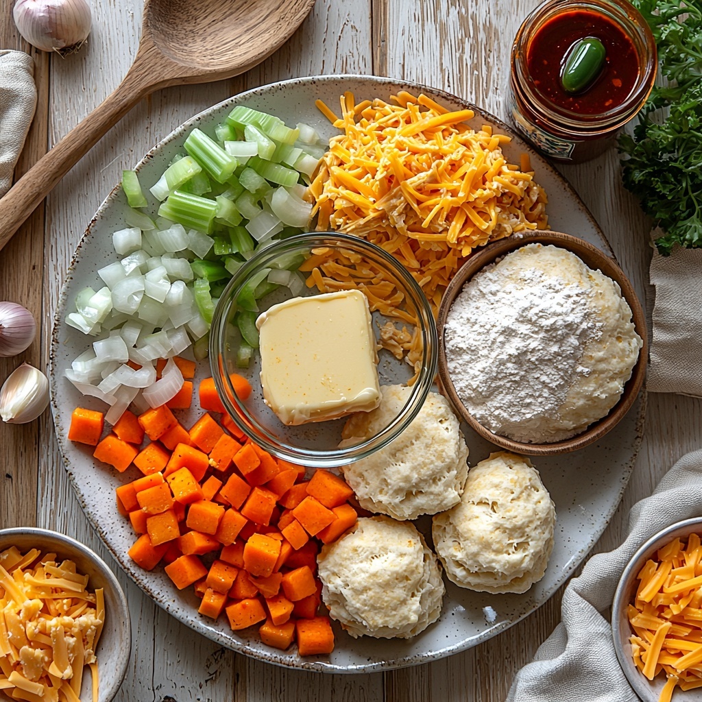 This recipe calls for simple but essential ingredients that each bring unique flavors and textures to the table. From the aromatic vegetables to the spicy buffalo sauce and flaky biscuit topping, every component plays an important role in building those layers of taste and comfort you’ll love.