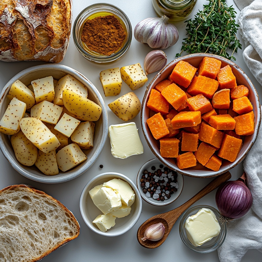 - Celeriac, peeled and cut (~600g): Delivers a subtle celery undertone and creamy texture once cooked.
