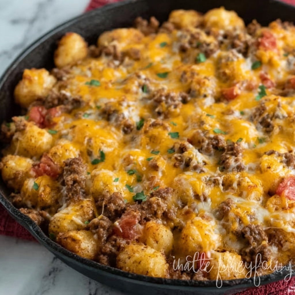 Once the tater tots are perfectly crispy, pull the casserole out of the oven and sprinkle the shredded cheddar cheese generously on top. Pop it back into the oven for another 5 to 10 minutes until the cheese is melted, bubbly, and slightly browned. This final touch adds a luscious, cheesy crown to your Cowboy Casserole Recipe that’s impossible to resist.