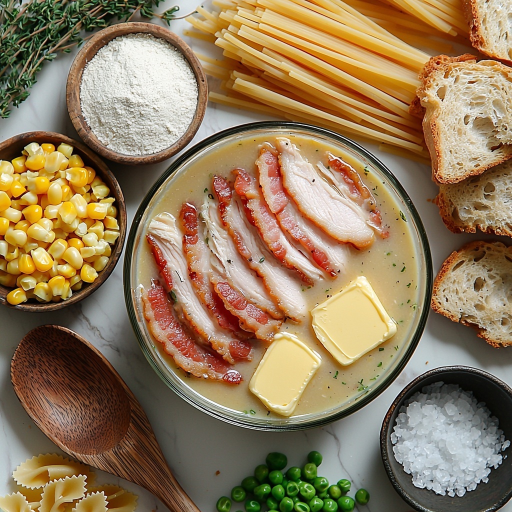 This recipe calls for simple, accessible ingredients that all play a crucial role in building layers of flavor, texture, and color. From the smoky streaky bacon to the fresh thyme and crisp vegetables, each item contributes to making this soup irresistibly creamy and satisfying.