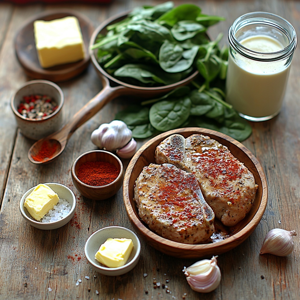 These simple yet essential ingredients come together beautifully to create a dish bursting with rich flavors, luscious textures, and vibrant color. Each element plays a key role: from the tender pork chops to the creamy sauce brightened by fresh spinach and fragrant garlic.