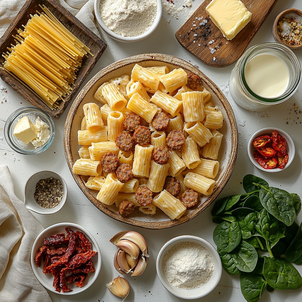 This recipe relies on simple, kitchen-staple ingredients that pack a serious flavor punch. Each component plays an essential role: from the hearty rigatoni pasta holding the creamy sauce, to the mild Italian sausage adding satisfying savory bites, and the sun-dried tomatoes lending a tangy sweetness that perfectly balances the richness.