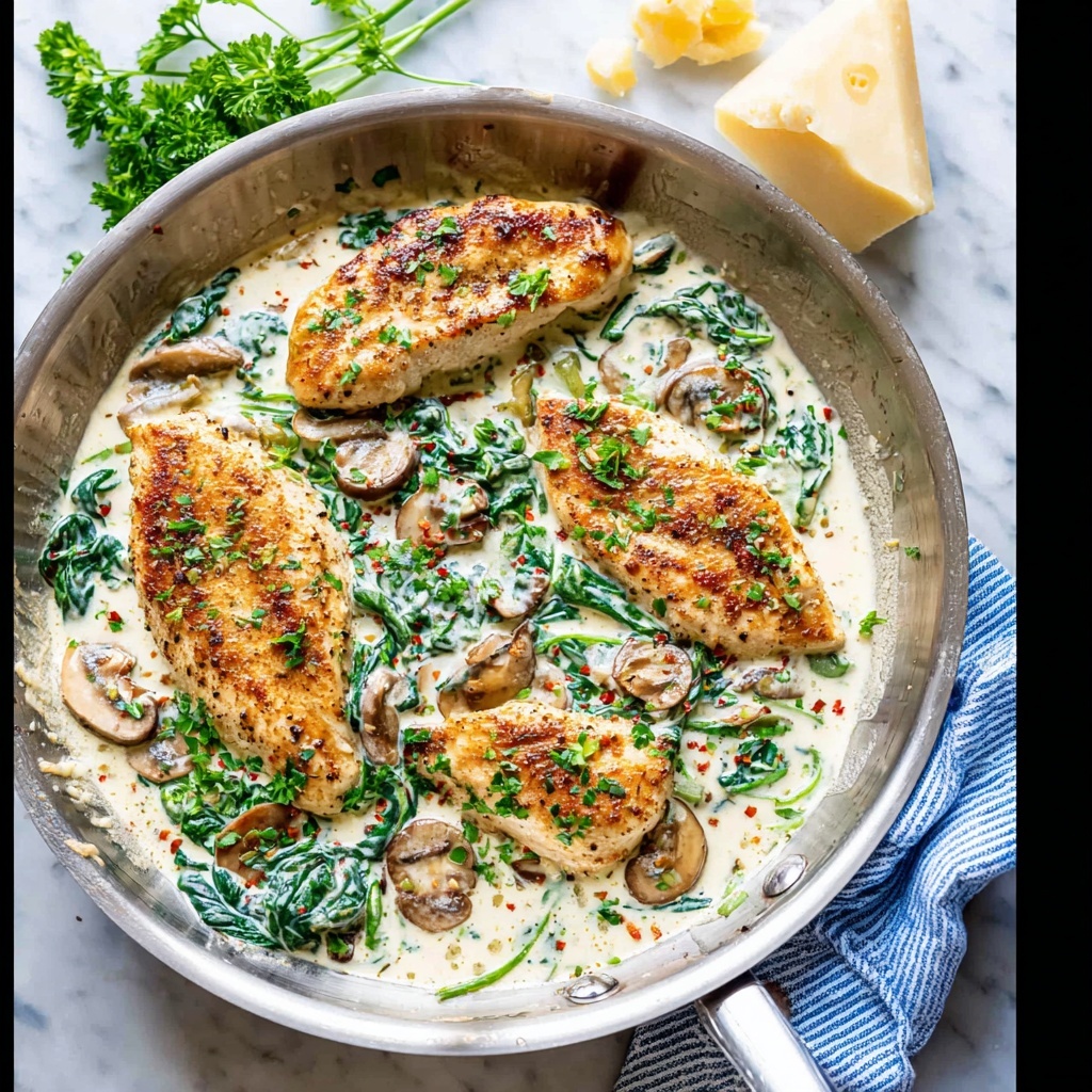 For a dinner party, consider plating the chicken over a swirl of the cream sauce with a small mound of spinach and mushrooms artistically placed on top. Serving in individual cast-iron skillets also keeps the meal warm and adds rustic charm.