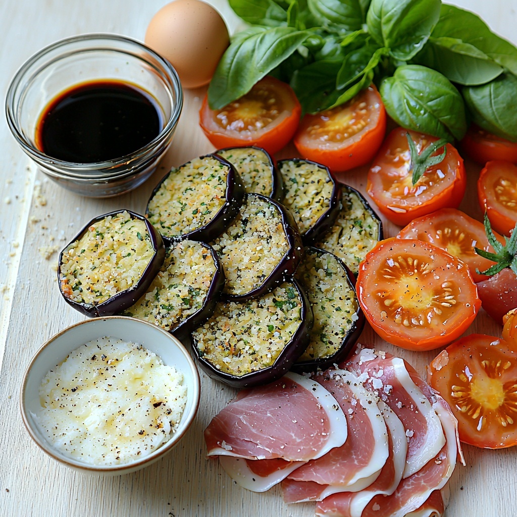 Gathering simple, fresh ingredients is key to making this salad shine. Each component plays an essential role in the overall texture and taste—from the crispy eggplant’s hearty crunch to the juicy sweetness of ripe tomatoes, the creaminess of mozzarella, and the savory prosciutto’s salty punch.