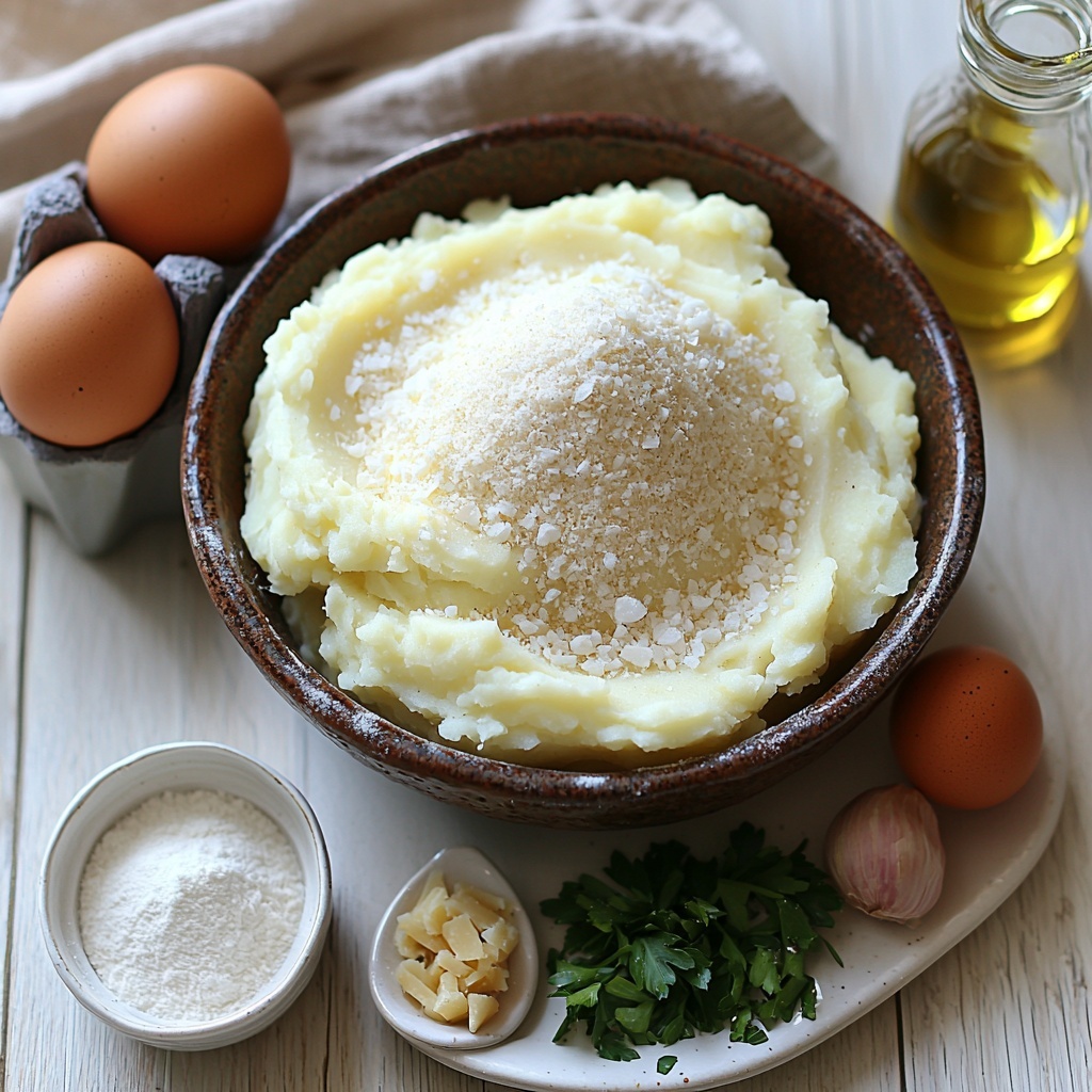 - Mix Ingredients: In a large mixing bowl, combine the mashed potatoes, grated Parmesan cheese, all-purpose flour, beaten egg, minced garlic, garlic powder, onion powder, salt, and black pepper. Stir everything together until the mixture is well blended and uniform.