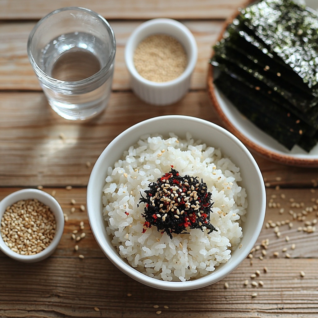 1. Prepare the Rice: In a mixing bowl, combine the freshly cooked medium-grain rice with furikake seasoning until well incorporated, ensuring the rice is evenly flavored.