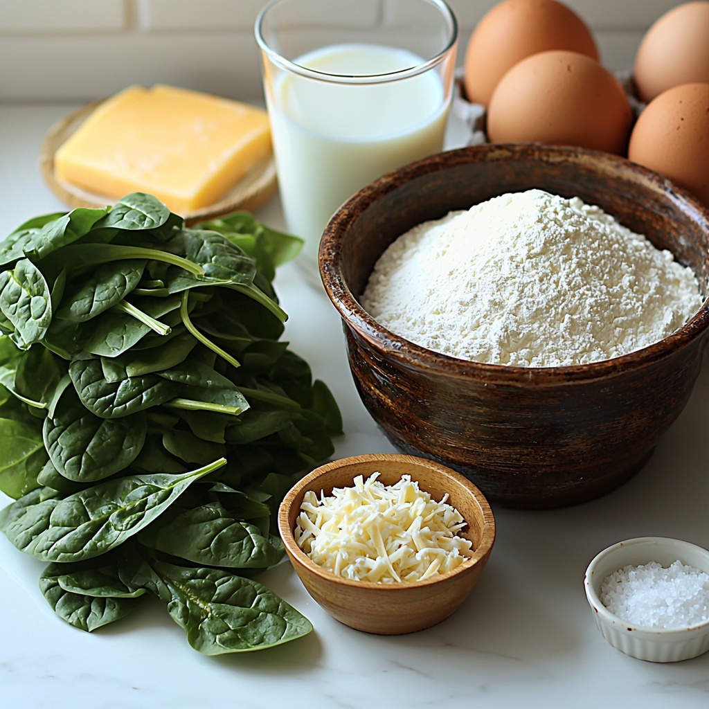 This recipe calls for simple, everyday ingredients that each play a key role in creating the perfect texture, vibrant taste, and appealing look. Fresh eggs provide the essential structure and protein, while spinach adds vibrant color and a fresh earthiness. The flour helps the omelet hold together when baked and rolled, and cheddar cheese brings that melty, savory touch we all love.