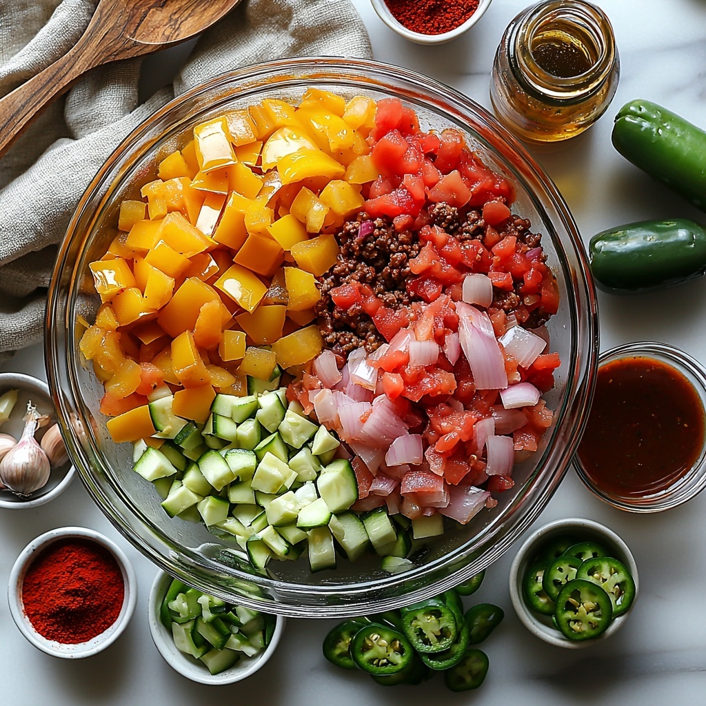 Gathering simple, wholesome ingredients is the secret to this dish’s rich flavor and amazing texture. Each one plays a crucial role, from perfectly browning the meats to building that deep, spicy tomato base and adding delightful bursts of freshness.