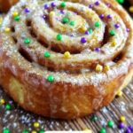 - Finish and Serve: After baking, drizzle the icing over the warm cinnamon rolls and sprinkle with colorful homemade sprinkles or food coloring to add a festive Mardi Gras touch before serving.