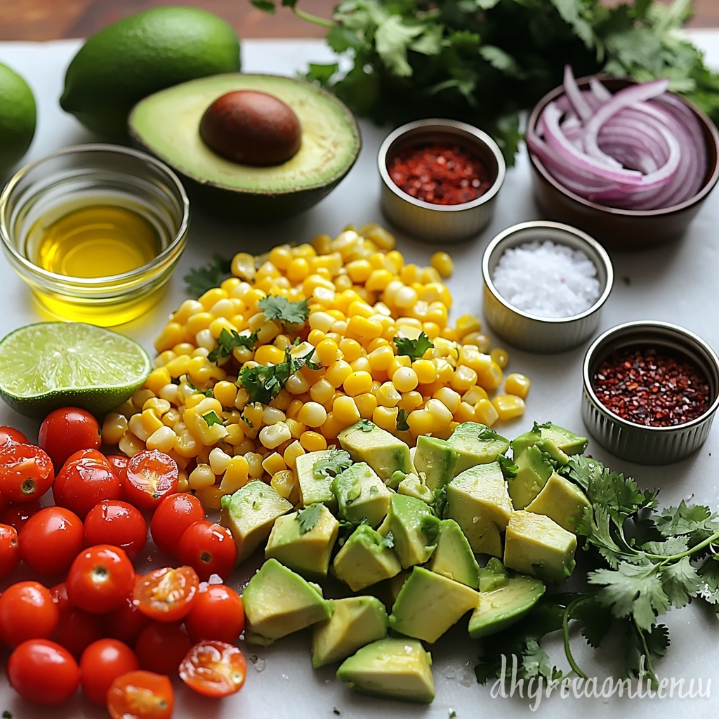 - Prepare the ingredients: Dice the avocado into medium-sized cubes and halve the cherry tomatoes. Finely chop the red onion and cilantro. If using canned or frozen corn, ensure it’s drained or thawed completely.