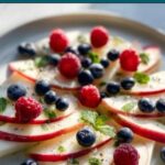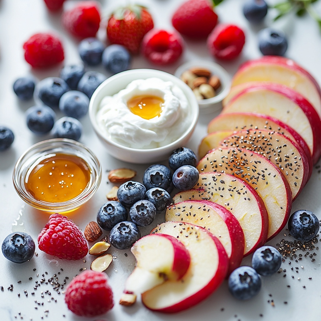 - Add Berries and Nuts: Sprinkle fresh berries over the yogurt-coated apple slices. Add chopped almonds, walnuts, and chia seeds if using, for added texture and nutrition.