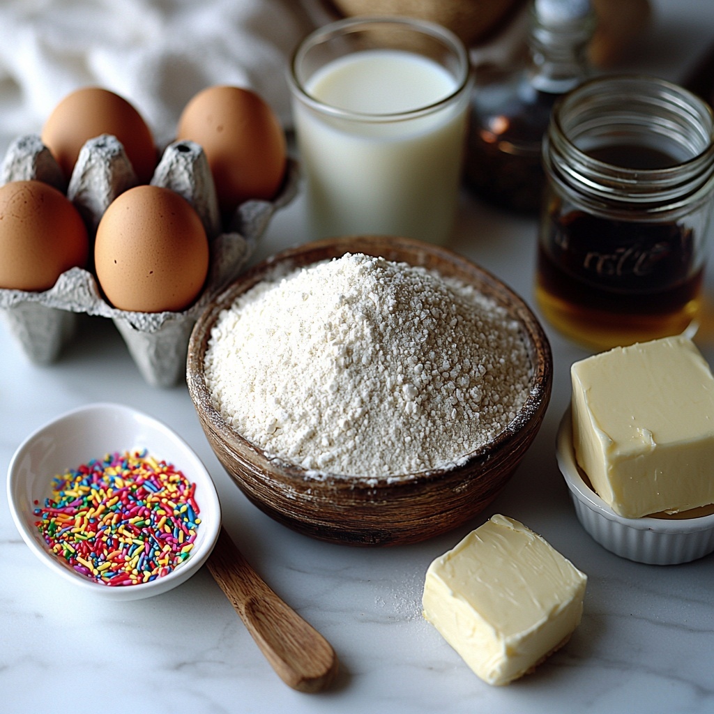 This Funfetti Bundt Cake Recipe uses simple, pantry-friendly ingredients that come together to build a soft, moist crumb and that iconic sprinkle-studded look and taste. Each ingredient plays an important role in the cake’s fluffy texture and sweet, buttery flavor.