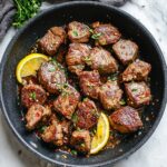 Savor the rich and flavorful Garlic Butter Steak Bites, a quick and easy dinner option ready in just 15 minutes. Tender ribeye cubes are seared to perfection and tossed in a luscious garlic butter sauce infused with fresh herbs, Worcestershire sauce, Dijon mustard, and a hint of lemon, creating a delightful meal perfect for any weeknight.