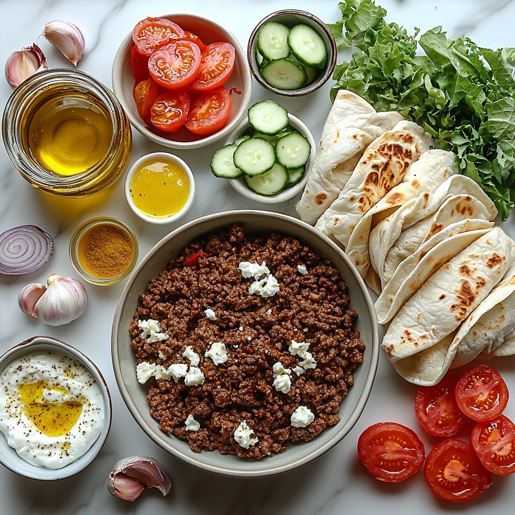 - Assemble the Wraps: Spread a generous layer of the cucumber feta sauce over each warm flatbread. Top with the seasoned beef mixture, then add sliced tomatoes, shredded lettuce, and thinly sliced red onion as desired.