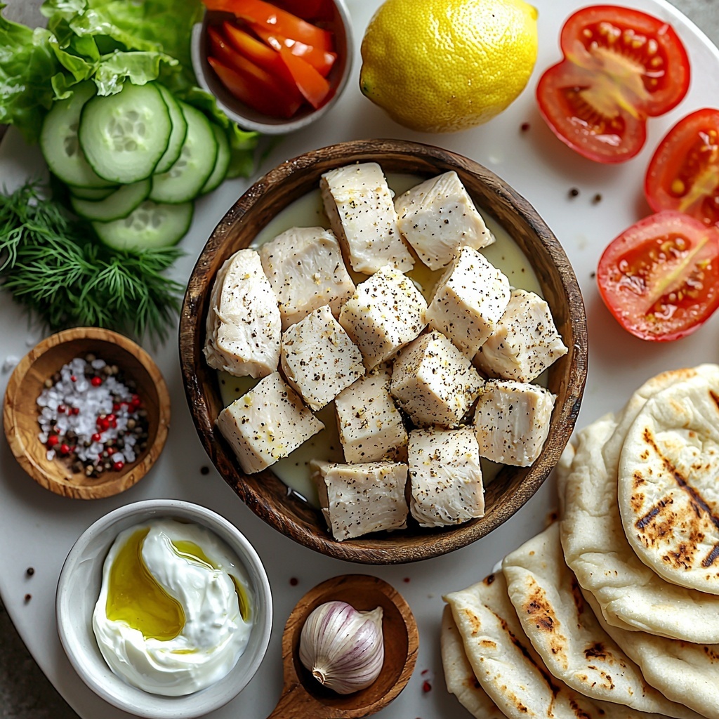 While the chicken marinates, mix up your tzatziki by combining Greek yogurt, finely chopped cucumber, lemon juice, minced garlic, and freshly chopped dill in a bowl. Season with salt, pepper, and a pinch of red pepper flakes if you want a subtle heat. Give it a good stir and cover it in the fridge so the flavors can mingle and chill alongside your chicken.