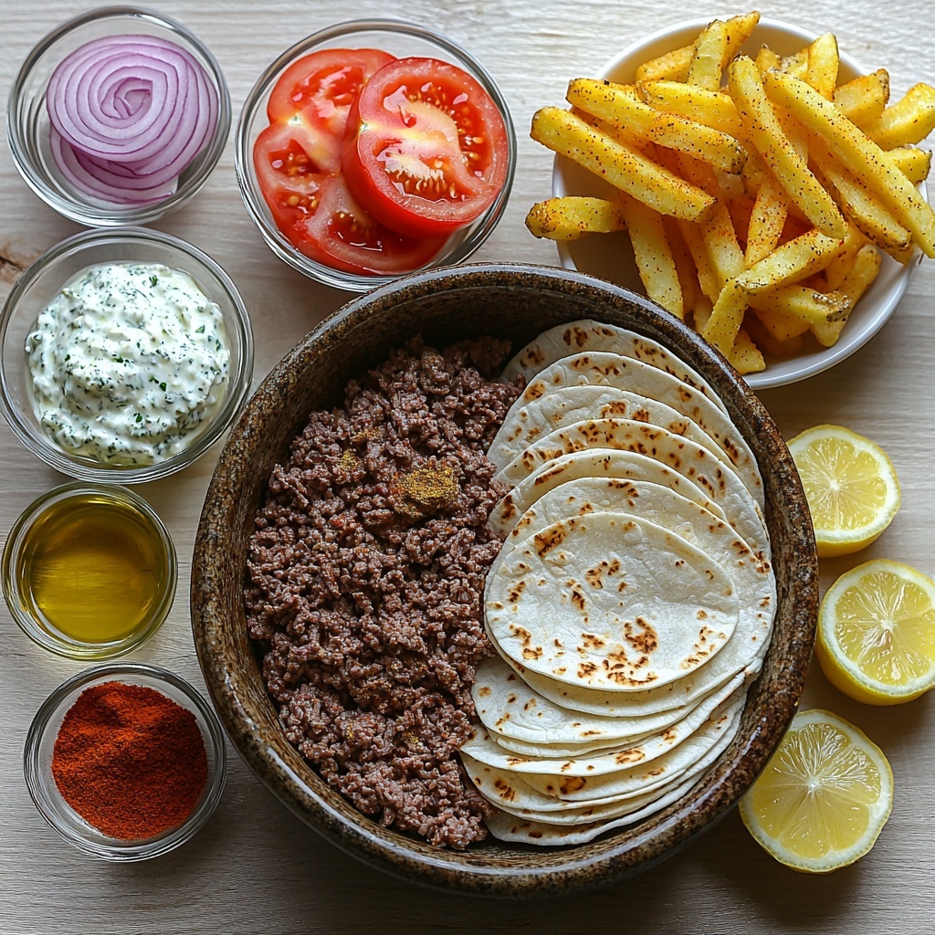 For a casual gathering, arrange the tacos on a large wooden board with bowls of tzatziki, sumac onions, and fries surrounding it, inviting guests to build their own. You could also serve the tacos open-faced on colorful plates with a sprinkle of fresh herbs on top, making the dish as beautiful visually as it is delicious. Get creative by adding a drizzle of hot sauce or a sprinkle of crumbled feta for extra character.