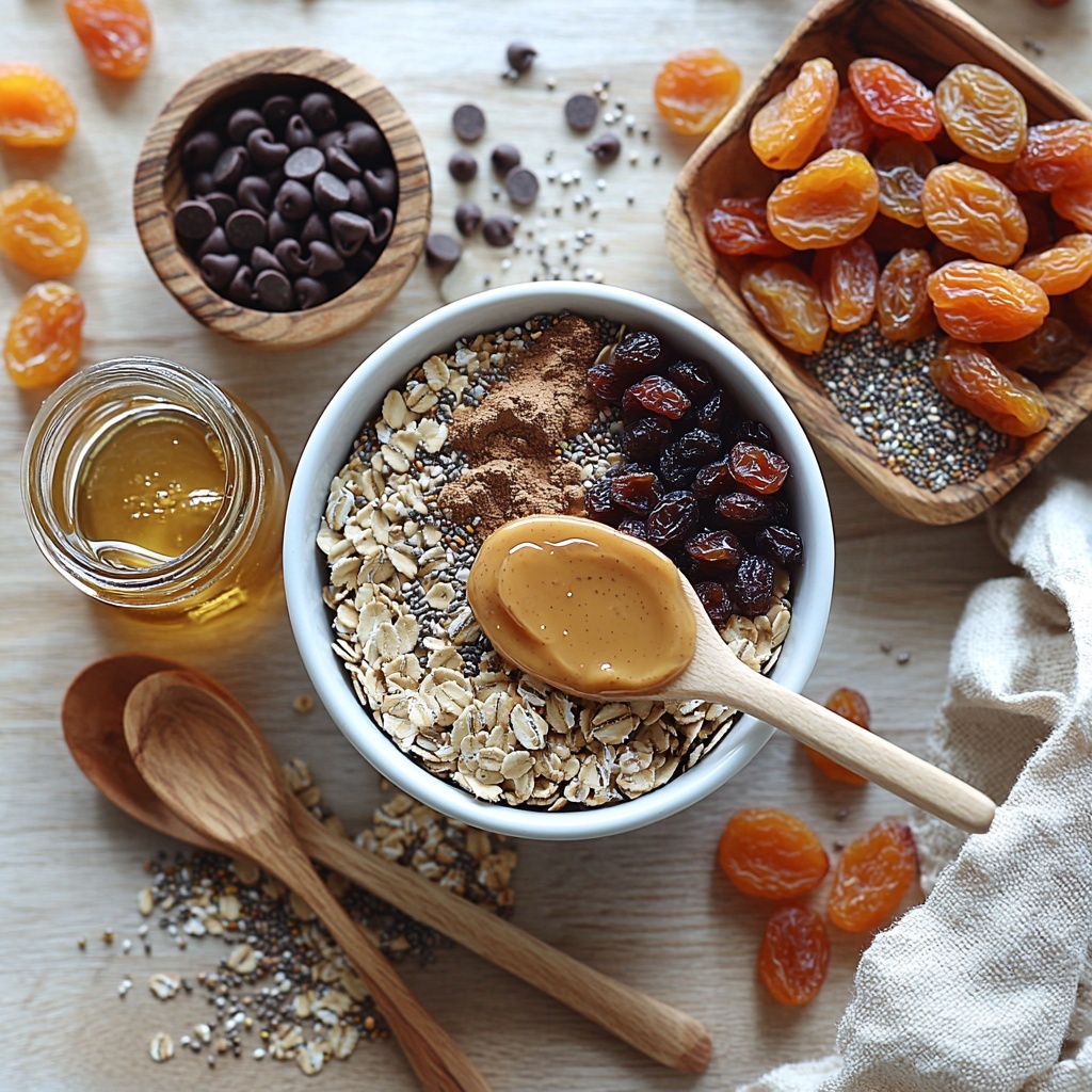 - Combine Dry Ingredients: In a large mixing bowl, stir together the rolled oats, chia seeds or flaxseeds, protein powder or hemp seeds, spices, mini dark chocolate chips, dried fruits, nuts, and superfood powders until thoroughly mixed.