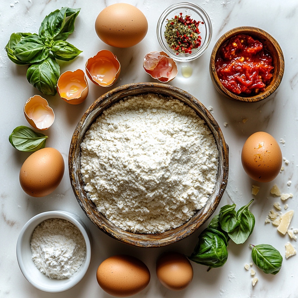 These ingredients might look straightforward, but each plays a crucial role in building the texture, flavor, and color of this dish. The flour provides the perfect foundation for tender pasta, eggs bind and enrich, and the fresh basil injects that unmistakable fragrant freshness into the sauce.