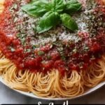 For an extra touch of elegance, twirl the spaghetti into individual nests and place them neatly on warm plates before ladling the sauce over. Garnish with small basil leaves and place a Parmesan crisp on top for a restaurant-style finish that will impress anyone lucky enough to share your meal.
