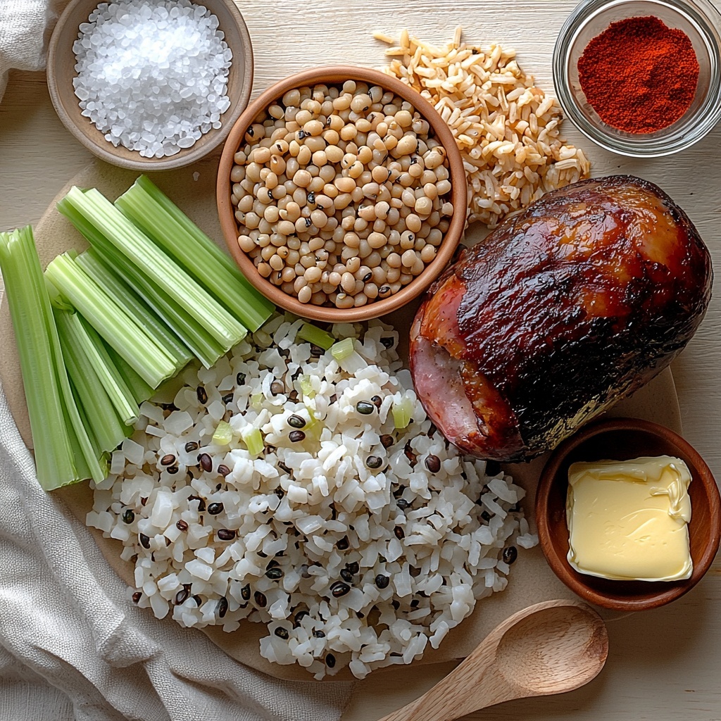 Gathering simple, wholesome ingredients is the key to making an authentic Hoppin’ John Recipe. Each one plays a vital role — from the sweet onion and fragrant garlic that build the base, to the smoky ham hock that infuses the peas with rich depth, creating a harmony of flavors and textures.