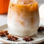 Serve your iced latte in a clear glass to showcase the beautiful layers of chai and pumpkin cream. Add a festive touch by tying a small fall-colored ribbon around the glass or serving with a reusable straw in a coordinated autumn hue for that extra cozy vibe.