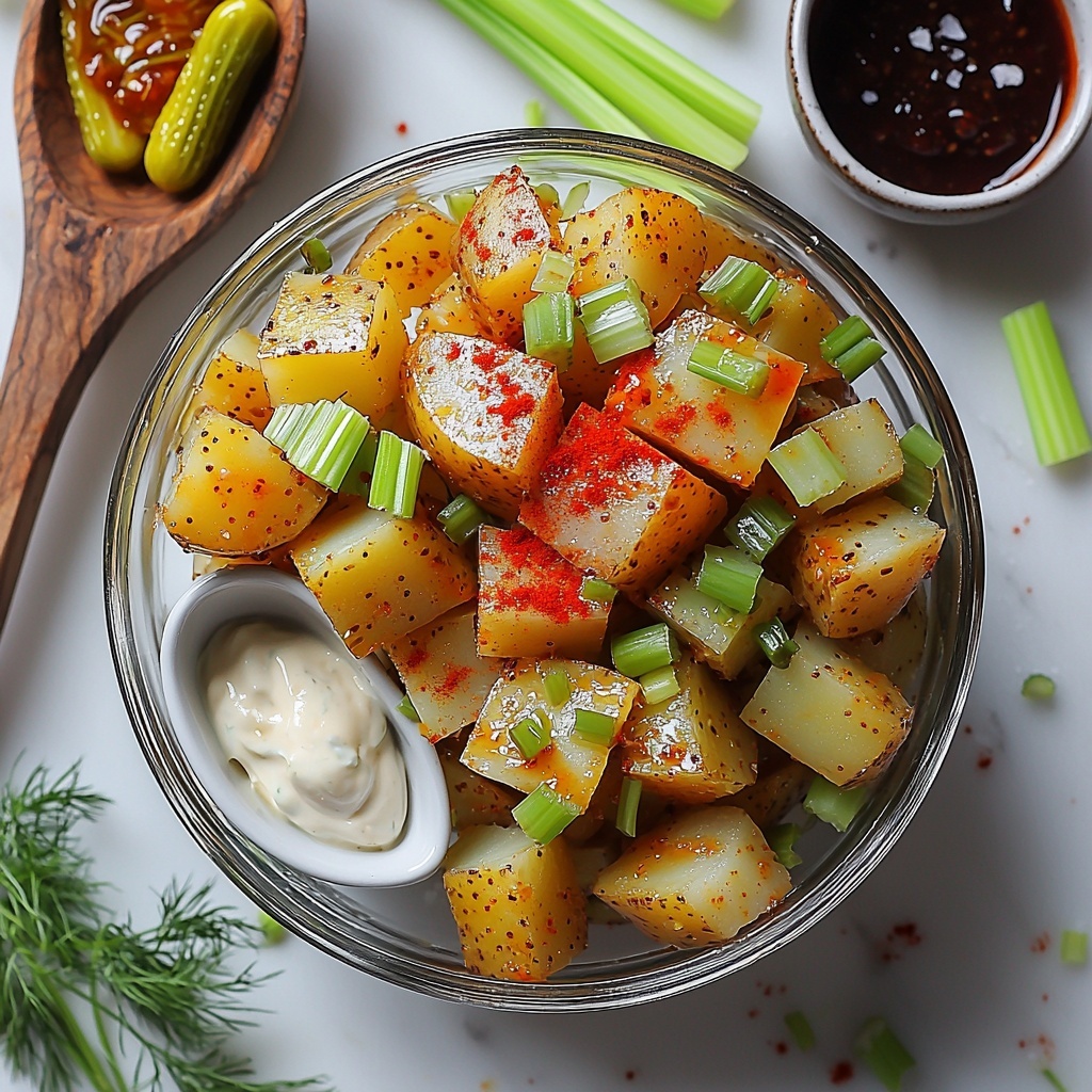 - Mix the Salad: Place the cooled potatoes in a large bowl. Add the chopped celery ribs, green onions, dried dill, and the prepared dressing. Season with salt and add the jerk sauce. Stir gently but well to evenly coat the potatoes and blend the flavors.