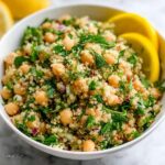 This vibrant Lemon Herb Quinoa with Chickpeas recipe is a wholesome, refreshing dish perfect for a light lunch or side. It combines fluffy quinoa cooked in vegetable broth with protein-packed chickpeas, fresh herbs like parsley, mint, and dill, and a zesty lemon dressing. Optional additions like cucumber, cherry tomatoes, feta cheese, and Kalamata olives add texture and bursts of flavor, making it a colorful and nutritious Mediterranean-inspired dish.