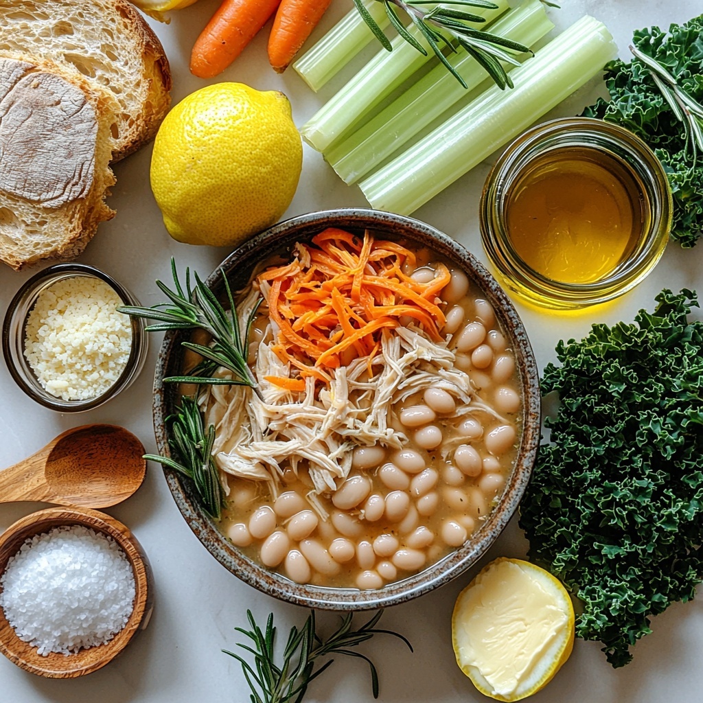 A hearty and refreshing Lemon Rosemary Chicken Soup that combines tender shredded chicken, fresh vegetables, and bright lemon juice with aromatic herbs. This comforting soup is perfect for a nourishing meal, featuring cannellini beans, kale, and a savory broth enhanced with rosemary and thyme.