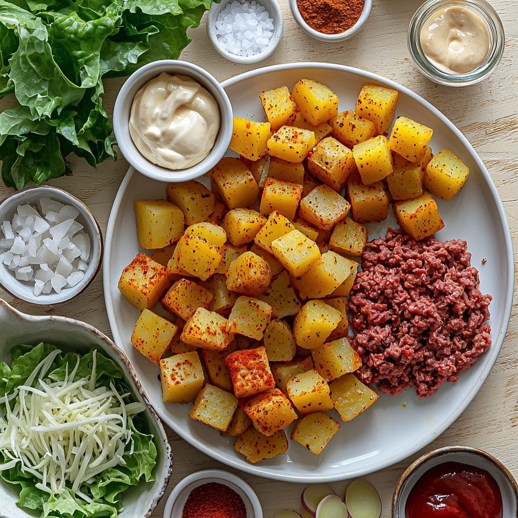 This Loaded Potato Big Mac Bowl Recipe uses ingredients that are straightforward yet essential—they work together to balance crispy, savory, creamy, and fresh elements in every bite. Each component plays a vital role in the overall harmony of the dish, from the tender potatoes to the punchy burger sauce.
