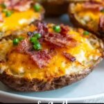 Delicious Loaded Potato Skins featuring crispy baked Russet potato shells filled with sharp cheddar cheese, savory bacon, and fresh green onions. Perfectly baked and topped with sour cream, these potato skins make a great appetizer or party snack.