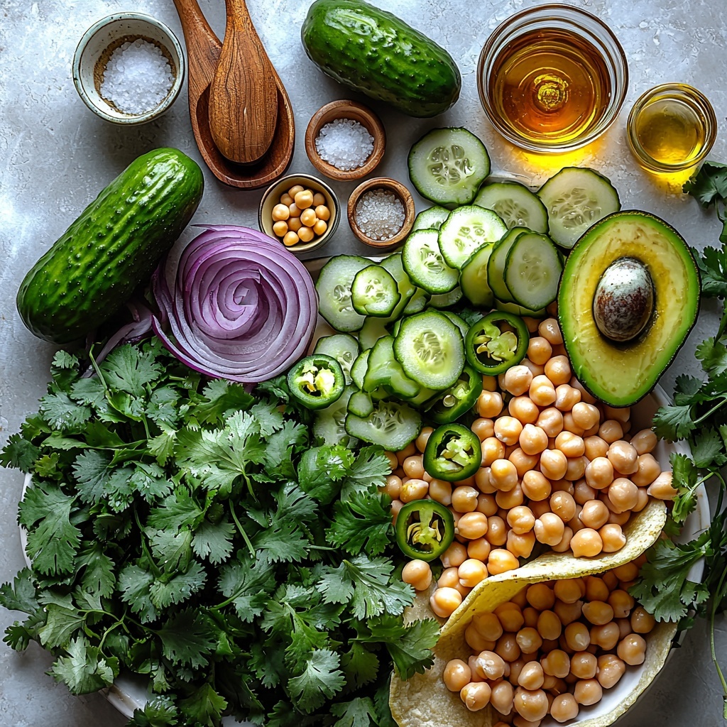 - Combine Salad Ingredients: To the bowl with onions, add the drained chickpeas, cannellini beans, drained cucumber, and remaining cilantro. Pour the dressing over everything and toss gently but thoroughly to combine all flavors.