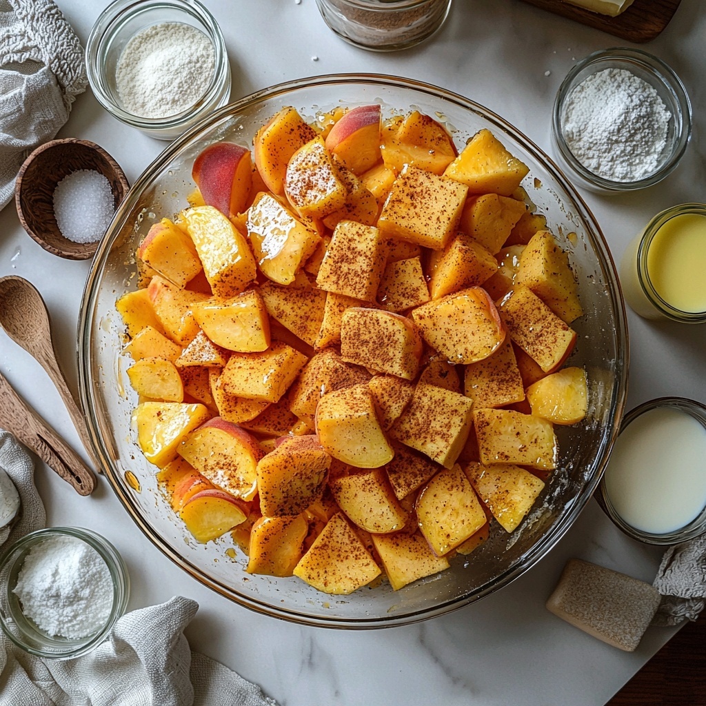 Start by mixing together your peeled and sliced peaches with lemon juice, sugar, cinnamon, and nutmeg in a large bowl. This combination not only sweetens the fruit but also infuses it with warm spices that are signature to this Old-Time Oven Peach Cobbler Recipe. If you’re a fan of thicker pie fillings, this is the time to add cornstarch. Letting this mixture sit for 15 minutes helps the peaches release their juices and the flavors meld beautifully.