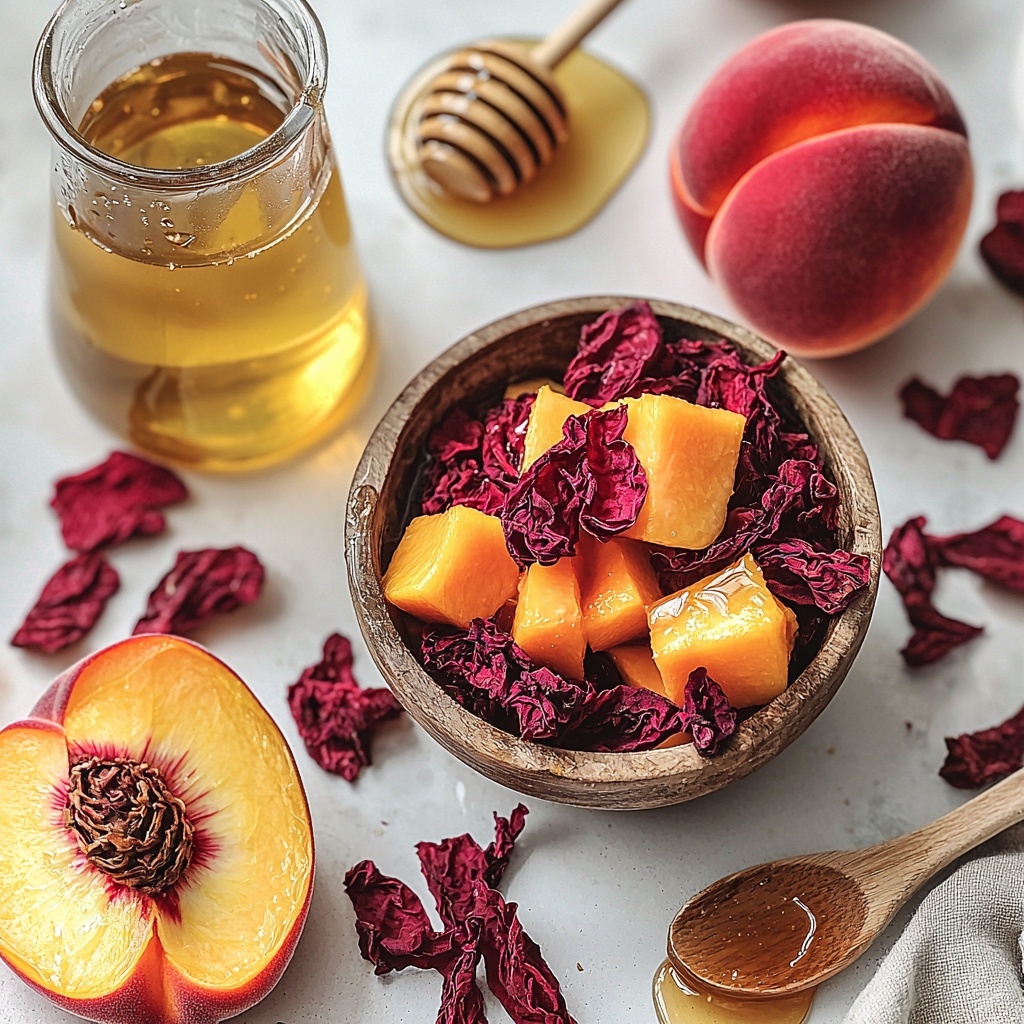 - Large fresh peach: A ripe peach adds an irresistible juicy sweetness and a touch of fruity texture that perfectly balances the hibiscus tartness.