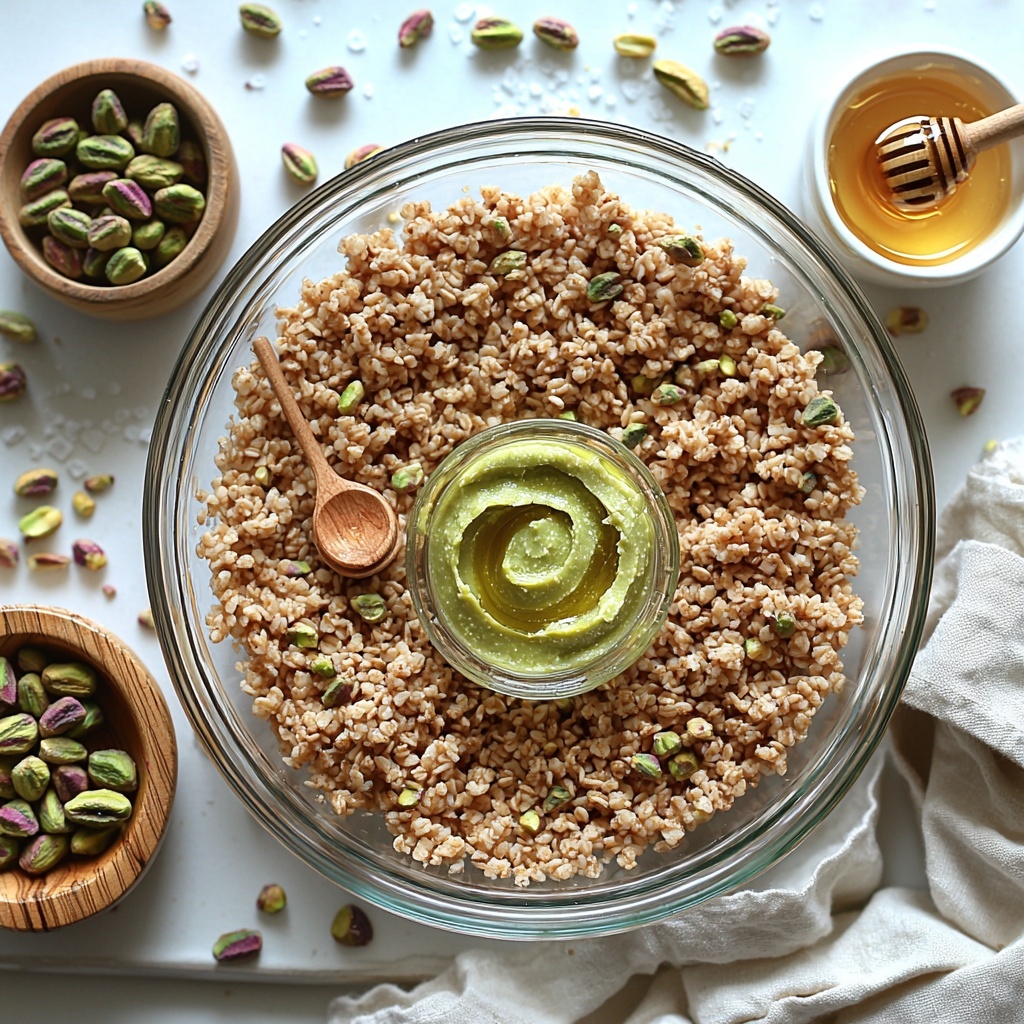 Simple ingredients make the magic happen here. Each one plays a crucial role: the brown rice cereal gives light crispness, chopped pistachios infuse savory nuttiness, and the honey, tahini, and pistachio butter bind everything with rich flavor and just the right chewiness. Let’s break down what you’ll need to create the perfect Pistachio Rice Krispie Treats Recipe.