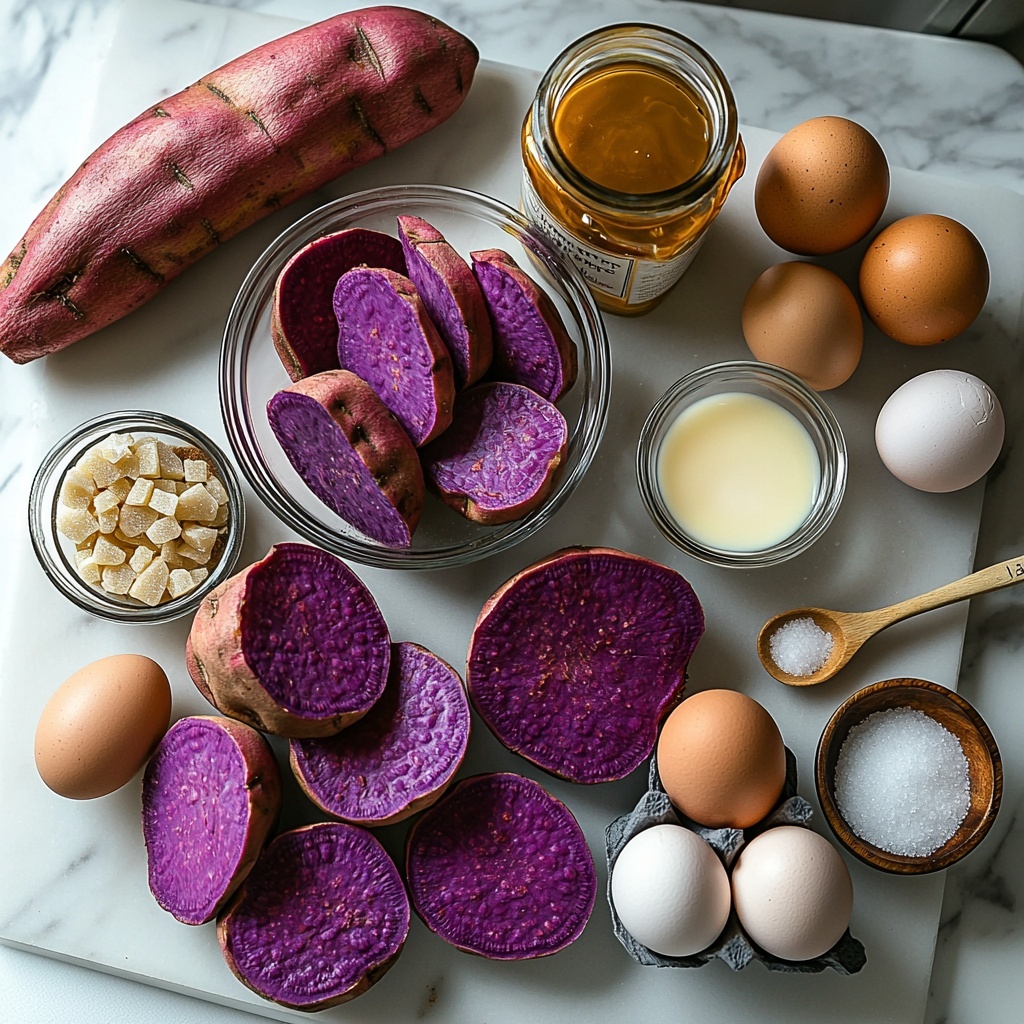 This recipe calls for straightforward ingredients that come together beautifully, each playing its own role in texture, taste, and that gorgeous purple hue. You’ll find that simple pantry staples combined with the rich flavor of purple sweet potatoes make this pie truly special.